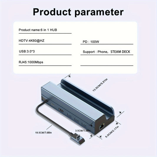 Steam Deck Dock 6 in 1 Steam Deck Rog Ally Docking Station Stand 3*USB 3.0 HDTV 4K@60Hz Gigabit Ethernet PD 100W Hub