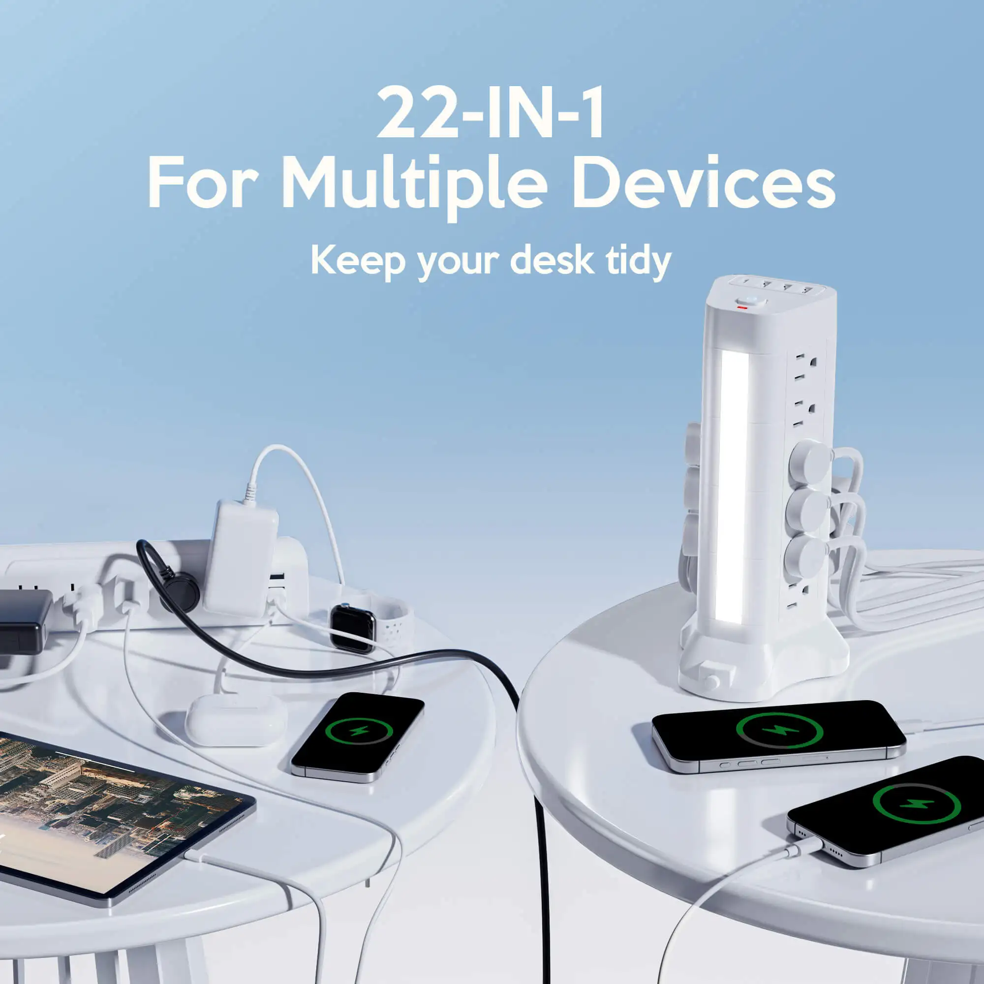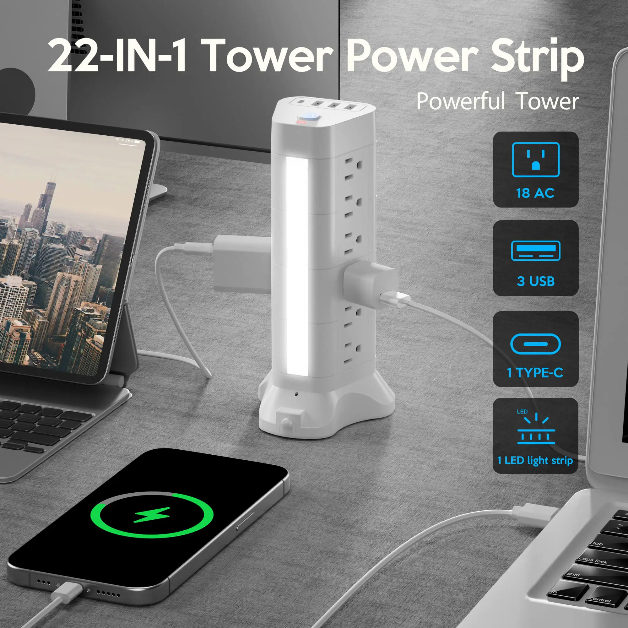 Upgrade your workspace or home setup with the ultimate 22-in-1 Power Strip Tower, designed for high-efficiency charging and organized power access. Featuring 18 AC outlets, 1 USB-C, 3 USB-A ports, and a tri-color adjustable LED desk lamp, it’s the perfect power solution for modern life.