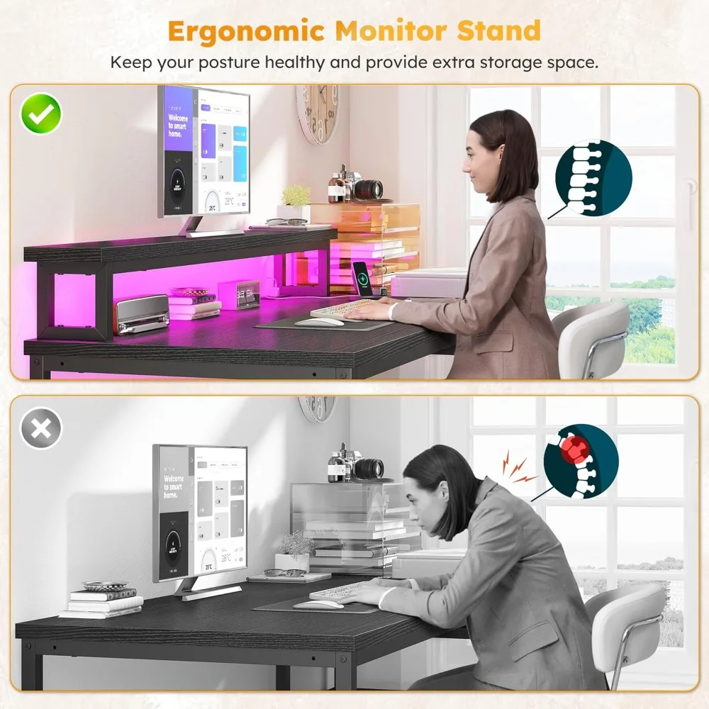 Computer Desk with Power Outlets and LED Lights,57 Home Office Desks with Drawers and Printer SpaceOffice Desk with File Drawers