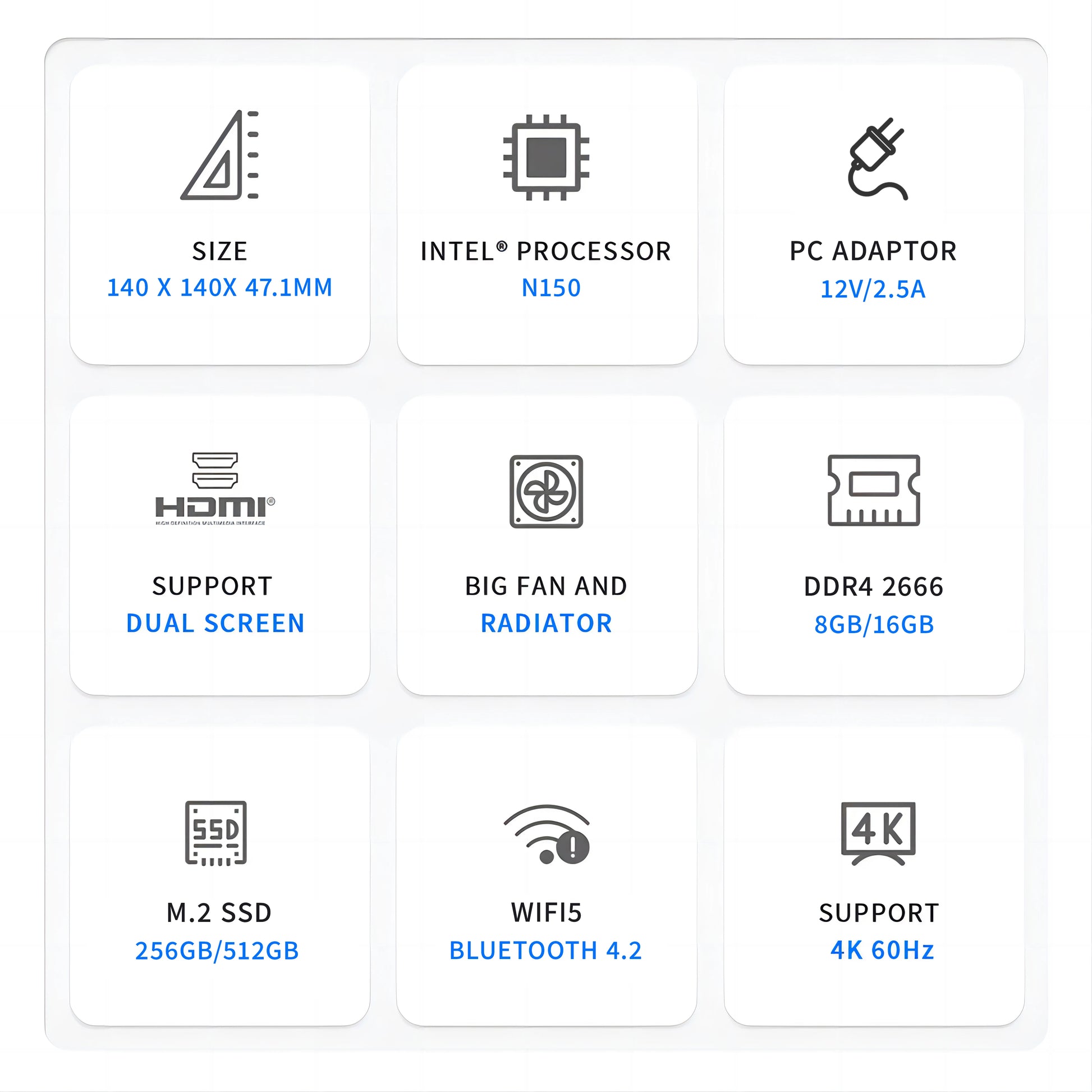 Intel® Jasper Lake Celeron Processor N150/N100, 4 Cores and 4 Threads. ( up to 3.6/3.4GHz)