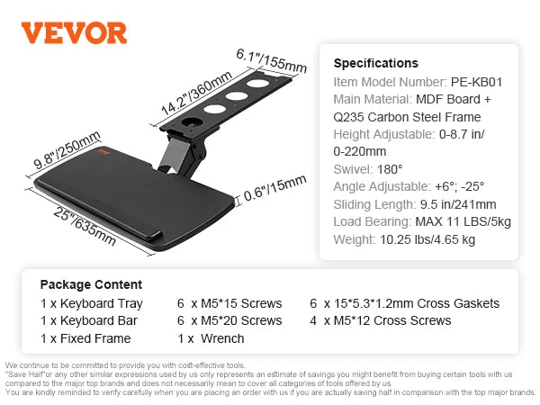 Keyboard Tray Size: 9.8 x 25 in/250 x 635 mm